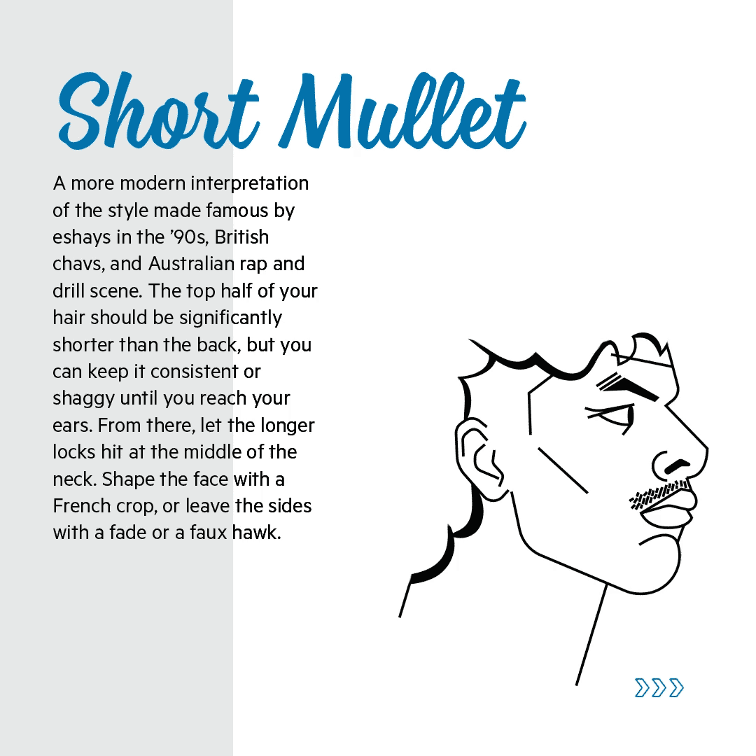 This mullet is a more modern interpretation of the style made famous by eshays in the ’90s, British chavs, and Australian drill rap scene. The top half of your hair should be significantly shorter than the back, but you can keep it consistent or shaggy until you reach your ears. From there, let the longer locks hit at the middle of the neck. Shape the face with a French crop, or leave the sides with a fade or a faux hawk.